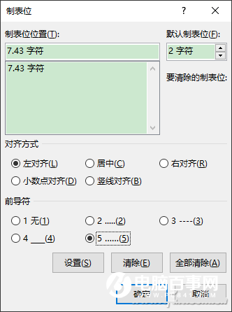 双击制表位标志可以打开它的设置对话框,在前导符栏中,选中第5项。