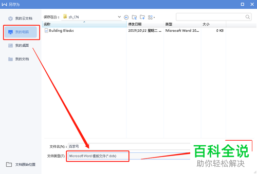 6. 在打开的“另存为”窗口中,设置文件保存的位置,在下方,设置文件类型为“Word模板文件”格式,最后点击右下角的保存即可。