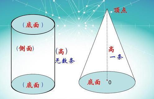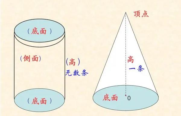 高不同:圆柱有无数条高,圆锥只有一条高。