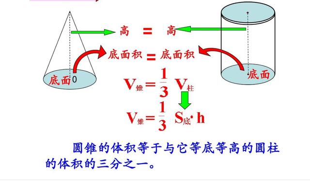 体积不同:一个圆锥的体积等于与它等底等高的圆柱的体积的1/3。圆柱的体积是底面积×高。