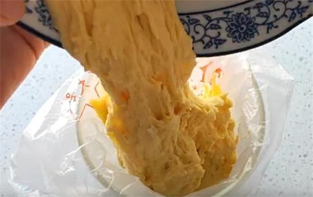 2.发好的面搅拌排气,倒入裱花袋内,如果是冷藏发酵一晚的面有酸味,我们可以加少许的小苏打来中和酸味。