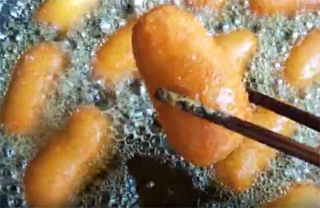 3.油温四成热左右微热挤入面糊,全程用小火不停的翻动炸制,在炸的过程中我们可以看到它有明显的鼓起,这个时候我们可以用牙签稍微扎一下来放气,防止炸裂,开炸至飘起表皮金黄酥脆即可出锅。