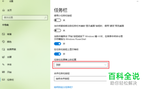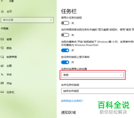 5. 如图,在右侧打开的页面,找到任务栏在屏幕上的位置选项,点击下方的下拉框,在打开的菜单中,选择【底部】即可。