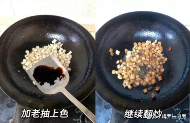 第五步:锅底烧热以后,加上少许食用油,倒入腌制好的瘦肉丁,用锅铲迅速翻炒,加上少许料酒去腥,加上生抽一勺,翻炒均匀。 第六步:倒入豆干丁和青豌豆,加上少许清水,加上生抽和蚝油,放入青红辣椒,加上食盐和鸡精等佐料。