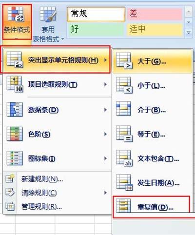 1、首先打开excel2007工作表,用鼠标框选选中可能存在重复数据或记录的单元格区域。单击“开始”选项卡中的“条件格式”打开菜单,在“突出显示单元格规则”子菜单下选择“重复值”,打开。