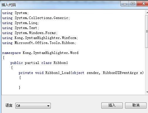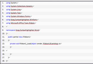using System; using System.Collections.Generic; using System.Linq; using System.Text; using System.Windows.Forms; using Kong.SyntaxHighlighter.Winform; using Microsoft.Office.Tools.Ribbon; namespace Kong.SyntaxHighlighter.Word { public partial class Ribbon1 { private void Ribbon1_Load(object sender, RibbonUIEventArgs e) { } } } 步骤十:我在Word中生成这段代码的时候,用了ol和li,并且设置了ol以及li的style,这样在word中就可以显示边框以及交替行的颜色,同时给ol设了一个class=codeBlock,妄想在发布到博客后可以通过这个样式名codeBlock来自定义自己喜欢的样式。我在word中生成的代码大概是这个样子: