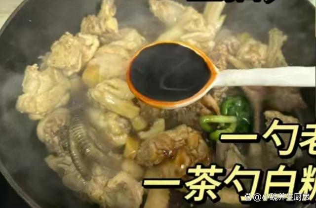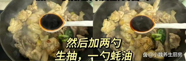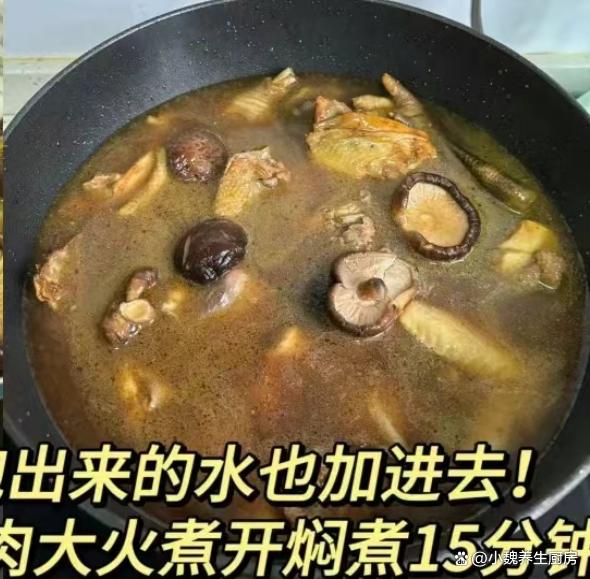 第七步:加上两勺生抽和一勺蚝油,加上一勺老抽,加上少许白糖,倒入一些香菇,加上适量清水,没过全部的食材,大火炖煮15分钟。