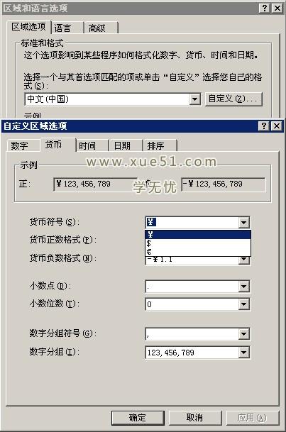3、打开“自定义区域选项”对话框,单击“货币”选项卡,在货币符号列表中选择自己想更改的货币就可以了,小数位数也可以根据自己的需求来设置。