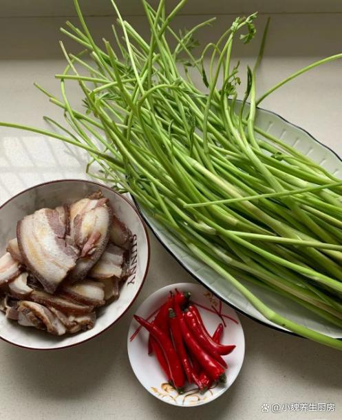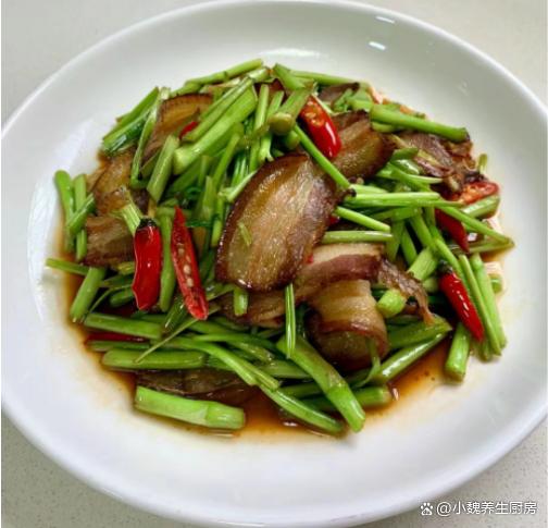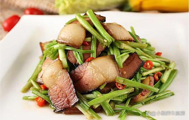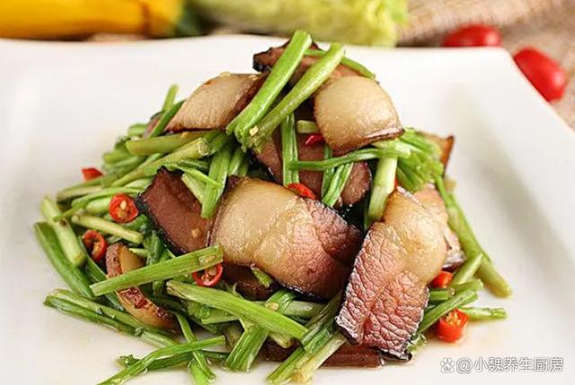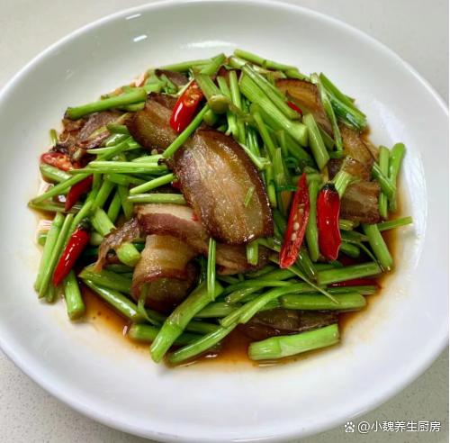春日和煦,阳光明目,已经迈入到4月份中期,下周就要迎来谷雨节气,是春季的最后一个节气,雨水会非常充足,阳光和雨水滋润大地,许多野菜也因此上市了。说到此野菜,春季是最佳的食用季节,比如说水芹菜,清明菜和荠菜,遇见一定别手软。今天准备用水芹菜和腊肉搭配制作一道家常菜肴——水芹菜炒腊肉,几分钟就出锅了,解馋开胃,吃起来很有胃口。春天,遇见这菜别手软!搭配腊肉是绝配,香喷喷出锅,总吃不腻。  【水芹菜炒腊肉的详细食谱】 准备一些食材:选购新鲜野芹菜200克左右(野芹菜是春季常见的野菜之一,在农村到处都是,城里人抢着吃,水芹菜的香味独特,根茎非常脆嫩,可以搭配肉类一起吃),冷水少许,小米辣若干个,温水少许,若干瓣大蒜头,食用油少许,鸡精和味精半勺,少许食盐,选购腊肉250克左右(腊肉是一种地方特产,是用五花肉制作而成的腊味,风味独特,肥而不腻,吃起来特别下饭),几片生姜,其他调味品。 详细制作顺序: 第一步:提前选购好水芹菜,腊肉和其他配菜,先把大蒜头剥掉蒜皮,切成若干细末,几片生姜切成细末,备用。第二步:先把水芹菜的根部掐掉,切掉根部一部分,反复用清水洗干净,切成肠道相同的段,放在一边备用。第三步:几个小米辣去掉蒂,洗净切成若干小圈,腊肉用淘米水浸泡,锅中煮一些清水,放入腊肉焯水几分钟,捞出用清水冲洗干净,切成厚度相同的片状,准备好其他的配菜,开始烹饪这道水芹菜炒腊肉吧。 第四步:锅底提前烧热一会儿,加上少许食用油,倒入切好的腊肉,将其煎出肥腻的油脂,迅速翻炒均匀。