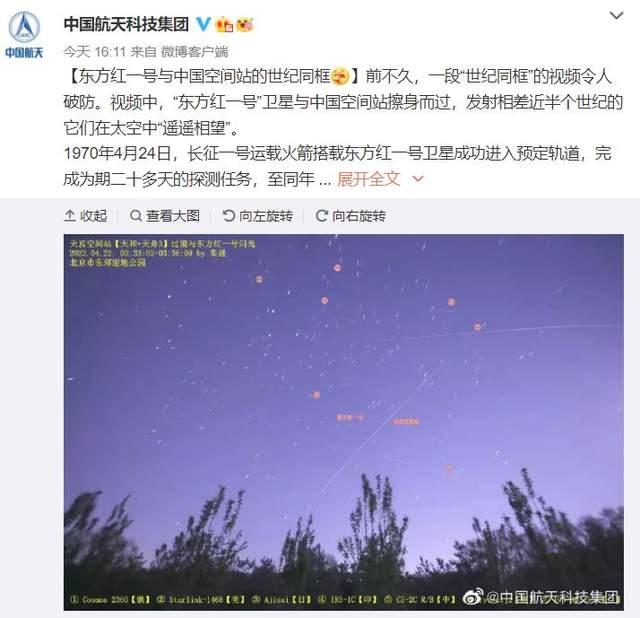 中国航天科技集团发了一条微博,内容是东方红一号和中国天宫空间站擦肩而过,两个极具标志性的航天器就这样在天空中遥遥相望,北京天文馆研究院朱进拍下了这一幕,世纪性的同框让不少网友泪目,遥想1970年4月24日