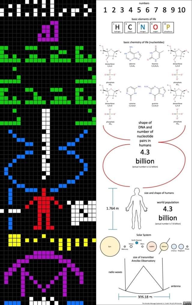 阿雷西博信息共有1,679个二进制数字,而且1,679这个数字只能由两个质数相乘,因此只能把信息拆成73条横行及23条直行,这是假设该信息的读者会先将它排成一个长方形。如果把它排成23条横行,它会变成白色杂讯,相反如果把它排成73条横行,便可排出图中的信息。