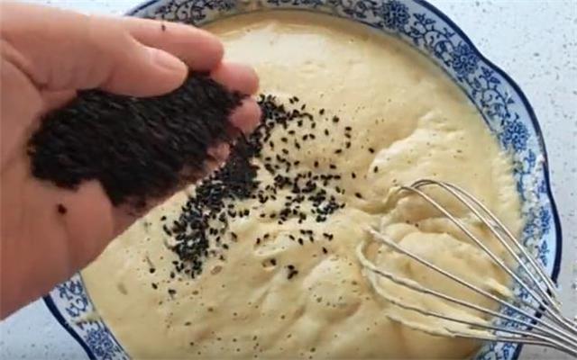 3.接下来把发酵好的面糊加入一把黑芝麻搅拌均匀,黑芝麻后放防止掉色。www.ws46.com