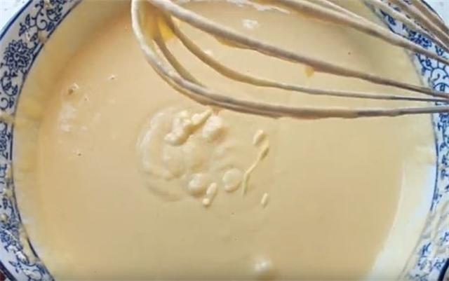 4.起锅烧油,油温5到6成热,就是微微冒烟的时候,我们把勺子先放入油锅中加热一下,然后用勺子的背部像这样向前推着,沾满面糊即可。