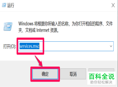 3. 第三步根据下图箭头所指,先在方框中输入【services.msc】,接着点击【确定】选项。