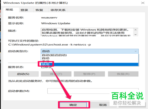 5. 第五步打开【属性】窗口后,先将【启动类型】设置为【禁用】,接着根据下图箭头所指,点击【确定】选项。