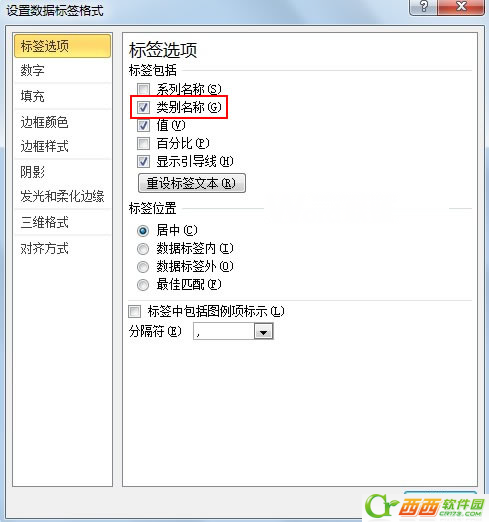 8.弹出设置数据标签格式对话框,我们在标签选项中直接勾选类别名称,关闭对话框。