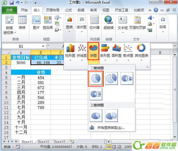 4.选择B1:D2单元格区域,单击菜单栏---插入--“图表”--“饼图”,选择二维饼图中的第一种样式。