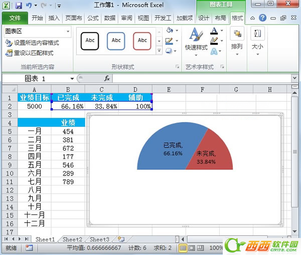 半圆百分比进度图,是指表达工作进度完成百分比比例的特殊饼图,案例包括数据模型建立、格式设置、添加数据标签等内容。下面,小编就来带领大家一起制作一份半圆百分比进度图。 1.创建图表,必须要有数据,我们先启动Excel2010,简单的输入一些数据,包括业绩目标,未完成和完成的百分比,各个月份的业绩情况。