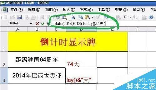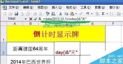 5、同理制作2014年巴西世界杯倒计时,编辑栏内输入公式:=date(2014,6,13)-today()&"天"