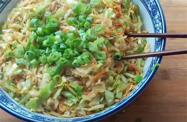 6.锅中热油,我们下入攥干的包菜翻炒几下,下入粉丝、胡萝卜丝,也可以加一些木耳丝,然后加入花椒粉和味精,再加入适量的生抽,翻炒均匀即可出锅,出锅以后加一些葱花,包菜这样炒一下之后能够有效的断生,使其变软,方便我们包制。