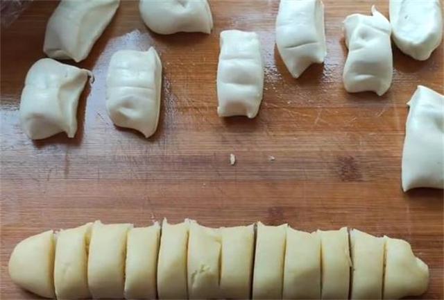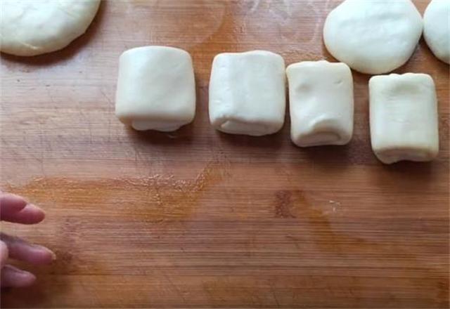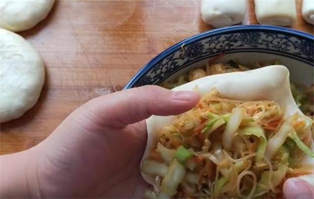 11.所有做好之后,把第一个先做好的这个擀开,因为这个时候它已经有足够的时间松弛,擀薄以后像包包子一样放入馅料收口即可,这个口一定要收紧,然后放在案板上按压平整。
