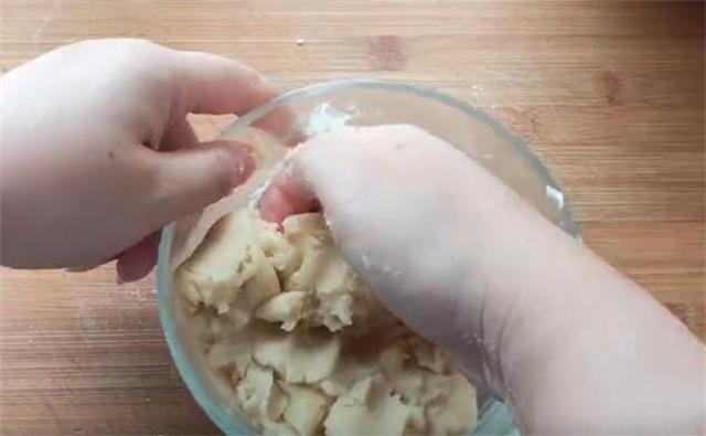 9.再用面皮包裹住油酥,虎口转动收紧,按扁备用。