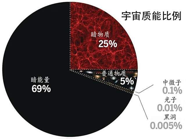 我们宇宙中暗能量占比68.3%,暗物质占比26.8%,而我们能看见的普通物质只占了4.9%,可观测宇宙3%的星系,其余的就永远消逝在了不断膨胀的宇宙空间中。