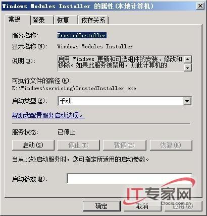 图:停用TrustedInstaller服务 接着单击该属性设置窗口中的“常规”标签,在该标签页面中我们会发现目标系统服务在默认状态下已经被Windows Server 2008系统正常启用,此时我们应该及时单击“停止”按钮,将目标系统服务暂时禁止运行,同时将该系统服务的启动类型参数调整为“禁用”或“手动”,最后单击“确定”按钮保存好上述设置操作,如此一来Windows Server 2008系统日后通过网络进行在线更新操作时,其网络连接性能就不会受到模块安装服务“Windows Module Installer”的影响了。 (www.ws46.com) |