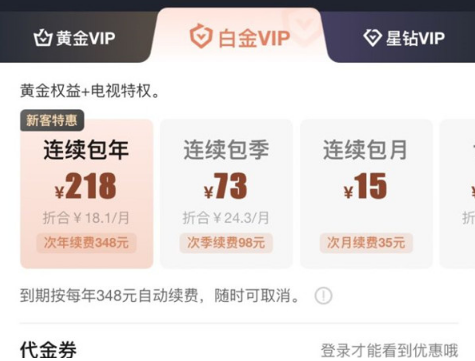 爱奇艺白金vip有什么用白金会员权益如下: 电视 手机 Pad 电脑 车载 智能家居 畅享大小屏,观影更顺畅 白金VIP会员新用户特惠,错过真的不知道什么时候再会有活动了 强烈推荐第一个种: ①白金会员连包首年 248元,原价348元,如果你是新用户可以送京东plus会员一年,如果不是新用户也可以288元购买白金会员年卡 京东plus会员 ②白金会员连包首季 73元,原价98元 ③白金会员连包首月 15元,原价35元 |