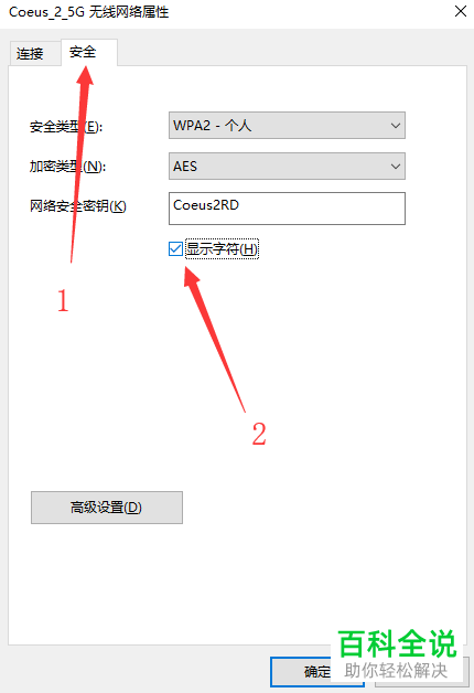 7. 最后在【无线网络属性】窗口中,根据下图箭头所指,先点击【安全】选项,接着勾选【显示字符】即可查看网络安全密钥。