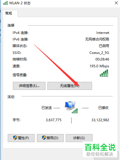 6. 第六步打开【状态】窗口后,根据下图箭头所指,点击【无线属性】选项。(www.Ws46.com)