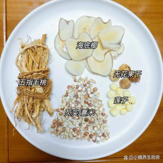 时间匆匆,已经进入到阳光明媚的四月,空气特别清新,草长莺飞,鸟语花香,景色非常宜人,让人心旷神怡,感受到大自然的气息。最近一段时间,老公都长胖了,肚子鼓起来很大,脸部出现水肿,舌苔非常异常,医生朋友说湿气太重了,可能是最近一直下雨,被湿气病毒入侵,导致免疫力低下,浑身都没有力气。春季是祛湿的“好时机”,要规律我们的作息,改善我们的饮食,可以尝尝这款汤品——五指毛桃海底椰薏米骨头汤,做法都很简单,喝起来巨鲜美。天然的“祛湿高手”发现了,春天要多喝这汤,健脾祛湿,全身轻松。  【五指毛桃海底椰薏米骨头汤的正确做法】 食材明细:选购新鲜筒子骨一斤(筒子骨也是猪骨的种类之一,骨头里含有大量的骨髓和蛋白质,全部是孩子发育所需的营养,筒子骨特别适合煲汤,喝起来超级鲜美滋补),五指毛桃50克(五指毛桃是南方人煲汤的法宝,是南方人对抗湿气的食材,非常适合煲汤,去除身体的毒素和湿气,促进新陈代谢,对身体颇有好处),冷水和纯净水少许,海底椰40克左右,芡实和薏米各35克左右,4个干无花果,白莲子20克左右,几勺料酒,半勺白胡椒粉,食盐若干,老姜15克左右,其他佐料。具体制作顺序: 1:提前选购好海底椰,五指毛桃,薏米和筒子骨等食材,先把海底椰用冷水泡发一会儿,控干表面的水分。2:先把无花果温水泡发,白莲子用清水洗净,然后用温水泡发2-3个小时,去掉里面的心,这样莲子更容易煮烂。3:将薏米和芡实清洗干净,薏米用冷水泡发几个小时,或者冷藏在冰箱,或者热锅炒一会儿,让表面稍微泛黄,盛出备用。4:将五指毛桃彻底洗净,生姜洗净切成片状,筒子骨让商贩剁成块,用冷水浸泡出血水,放在一边备用。 5:将筒子骨都放入锅中,加上适量冷水,水要没过食材,加上料酒和姜片,焯水5分钟左右,去腥处理,捞出备用。