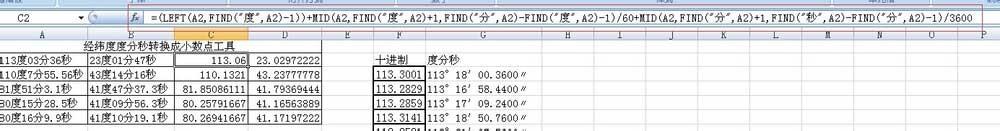 2、在函数框内输入:=(LEFT(A2,FIND("度",A2)-1)) MID(A2,FIND("度",A2) 1,FIND("分",A2)-FIND("度",A2)-1)/60 MID(A2,FIND("分",A2) 1,FIND("秒",A2)-FIND("分",A2)-1)/3600 这里是用A2单元格做演示,注意公式里的单元格。 输入之后即可得出相应的十进制经纬度。