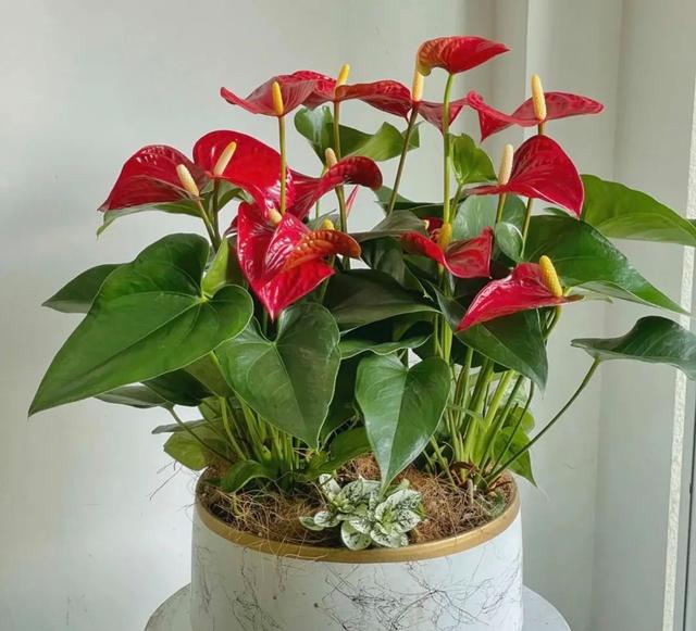 红掌也叫花烛,火鹤花,是天南星科多年生草本植物,红掌花色鲜艳,红红火火,叶片质感肥厚,色泽亮丽,在民间,是蒸蒸日上,大吉大利的寓意,可作为相互赠送的礼品。 红掌摆放在桌面和窗台,能营造出一个欢快的氛围,十分应景。而红掌还是一款四季花,无论你在任何季节购买,都能随时欣赏到美丽,花期长达300天。