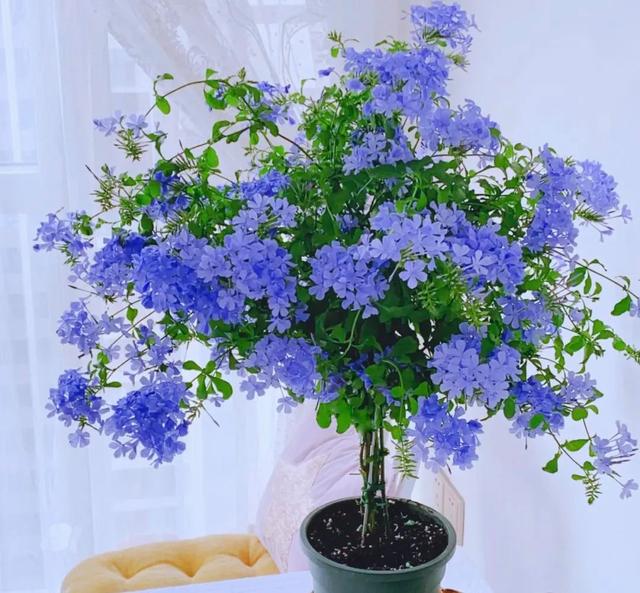 与前两种不同的是,蓝雪花的个头较大,是一种灌木植物,其花朵犹如蓝色的雪片,在夏日里,旁边放一盆蓝雪花,能给人一种清凉清新之感,还能营造出一种舒适的静谧氛围。 蓝雪花的茎蔓有很不错的攀爬性,在室外也可以开成一片蓝色的海洋,室内培养蓝雪花,多会打造出一个棒棒糖的外形,开花后宛如蓝色花球,温馨浪漫,美不胜收。