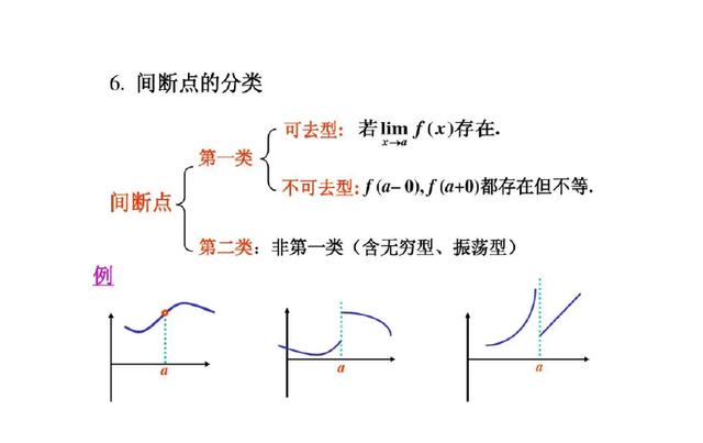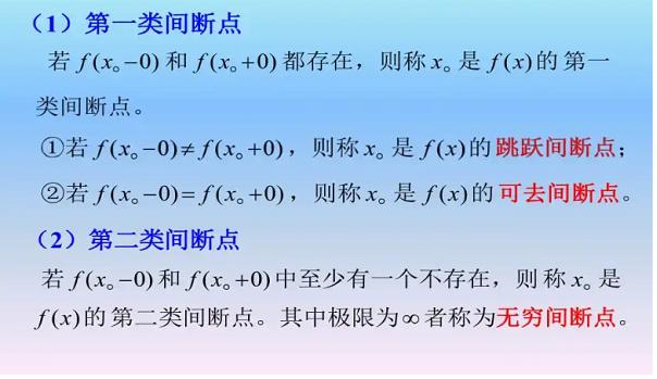 间断点的分类及判断方法: 然后用左右极限判断是第一类间断点还是第二类间断点,第一类间断点包括第一类可去间断点和第一类不可去间断点,如果该点左右极限都存在,则是第一类间断点,其中如果左右极限相等,则是第一类可去间断点,如果左右极限不相等,则是第一类不可去间断点,即第一类跳跃间断点。如果左右极限中有一个不存在,则第二类间断点。 间断点可以分为无穷间断点和非无穷间断点,在非无穷间断点中,还分可去间断点和跳跃间断点。如果极限存在就是可去间断点,不存在就是跳跃间断点。 给定一个函数f(x)如果x0是函数f(x)的间断点,并且f(x)在x0处的左极限和右极限均存在的点称为第一类间断点。若f(x)在x0处得到左、右极限均存在且相等的间断点,称为可去间断点。需要注意的是,可去间断点需满足f(x)在x0处无定义,或在x0处有定义但不等于函数 f(x)在x0的左右极限。