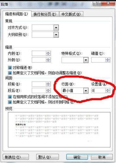 7、在弹出来的“段落”对话框里,把“行距”改成最小值,“设置值”改成0,点确定。 现在基本上就OK了,再把多余的空行删除掉就行了 第八个步骤是可能出现的情况,如果你通过上述七个步骤感觉已经满意了就可以保存然后打印了