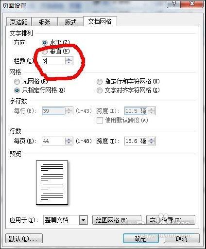 4、在弹出来的“页面设置”对话框里点击“文档网格”,把“栏数”改为3格,然后点确定。