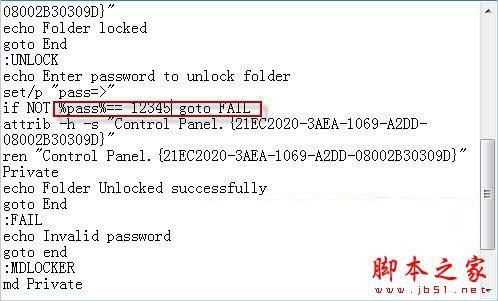 第二步:打开该文件夹,右键单击窗口空白处选择“新建→ 文本文档”命令创建一个文本文件。 第三步:将以下代码复制到刚才的文本文件中: cls @ECHO OFF title Folder Private if EXIST "Control Panel.{21EC2020-3AEA-1069-A2DD-08002B30309D}" goto UNLOCK if NOT EXIST Private goto MDLOCKER :CONFIRM echo Are you sure you want to lock the folder(Y/N) set/p "cho=>" if %cho%==Y goto LOCK if %cho%==y goto LOCK if %cho%==n goto END if %cho%==N goto END echo Invalid choice. goto CONFIRM :LOCK ren Private "Control Panel.{21EC2020-3AEA-1069-A2DD-08002B30309D}" attrib h s "Control Panel.{21EC2020-3AEA-1069-A2DD-08002B30309D}" echo Folder locked goto End :UNLOCK echo Enter password to unlock folder set/p "pass=>" if NOT %pass%== PASSWORD_GOES_HERE goto FAIL attrib -h -s "Control Panel.{21EC2020-3AEA-1069-A2DD-08002B30309D}" ren "Control Panel.{21EC2020-3AEA-1069-A2DD-08002B30309D}" Private echo Folder Unlocked successfully goto End :FAIL echo Invalid password goto end :MDLOCKER md Private echo Private created successfully goto End :End 第四步:在上面的代码中,用自己想要的密码取代“PASSWORD_GOES_HERE”,比如:用12345。最后的效果是:if NOT %pass%== 12345 goto FAIL(如图2)