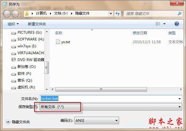 第五步:将文本文件另存为.bat格式,文件名可以定为“locker.bat”,注意:保存类型设置为“所有文件”才能保存成功(如图3)。(www.ws46.cOm)