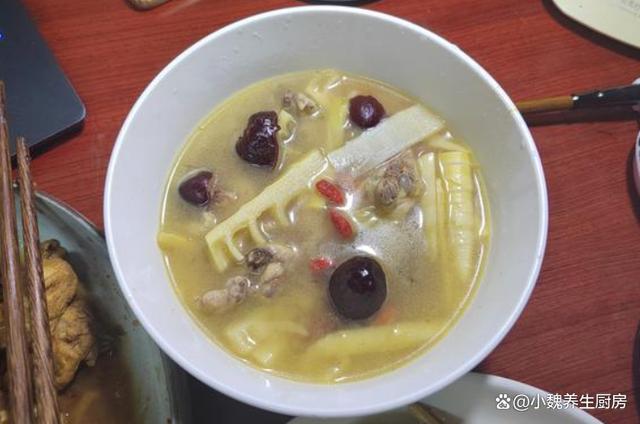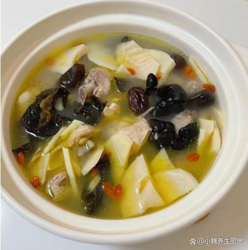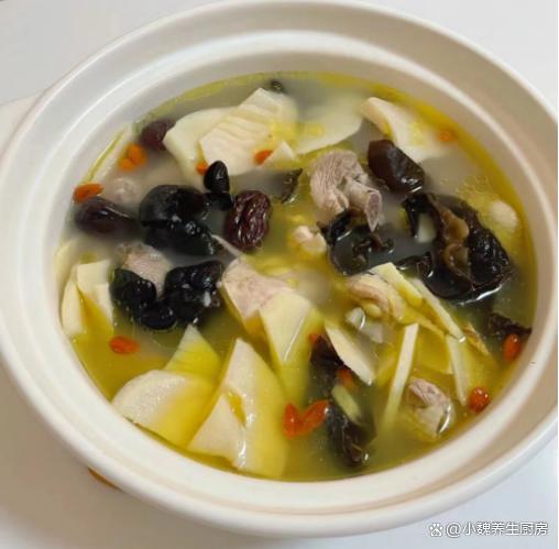 进入4月中旬以后,各地的气温都开始回升了,甚至温度已经达到20多摄氏度,空气里特别干燥,嗓子不舒服,总是觉得犯困,阳气不足,气色会非常差,我们需要给身体补充能量,调理我们的五脏,建议要养成好的作息习惯,平常要多喝一些鲜美的靓汤,比如说这款春笋木耳红枣土鸡汤,每周喝几次,鲜美十足,不懂吃可惜了。春季进补“黄金期”,建议要多喝这汤,补气补血,增强免疫少生病。  【春笋木耳红枣土鸡汤的正确做法】 食材清单:选购新鲜春笋300克(春笋是竹笋的品种之一,属于大自然的馈赠,清甜爽口,营养价值很高,搭配几种食材炒着吃,对身体有许多益处,春季碰见一定别错过),选购若干个红枣或蜜枣(红枣是补血的食材,要选择个头大一些,色泽非常均匀的红枣,煲汤煮粥都会丢入一些),黑木耳30克左右,黄芪20克左右,冷水和温水少许,挑选一只新鲜的土鸡(土鸡是一种很受欢迎的煲汤食材,鸡肉鲜嫩美味,炖出来的鸡汤更鲜美),生姜一块,几勺料酒,食盐少许,胡椒粉半勺。 详细制作过程:步骤1:提前准备好新鲜土鸡,春笋,木耳和红枣等食材,先把黑木耳用温水泡发开,切掉木耳的根蒂,反复清洗干净,也可以将木耳焯水处理,控干水分即可。步骤2:先把黄芪用水洗净,几个红枣冲洗干净,去掉红枣的内核,生姜去皮切成片状,枸杞子也清洗干净。 步骤3:将春笋的根部切掉,剥掉多余的叶鞘,洗净切成若干片状,土鸡提前宰杀好,剁成若干块状,用清水浸泡出血水,捞出控干表面的水分。 步骤4:准备好煲汤的汤锅,倒入洗净的鸡肉,放入一些姜片,加上适量冷水,放入一些葱段,加上少许料酒,提前把鸡肉焯烫处理,冲洗掉浮沫,炖鸡汤一定别忘记这一步。 步骤5:砂锅里放入鸡肉,红枣和黄芪,丢入一些姜片,加上纯净水足量,盖上锅盖炖煮一个小时,中途可以搅动一下,去掉一层油腻的物质。 步骤6:放入黑木耳和春笋,继续炖煮20分钟,让春笋的营养都融入汤里,鸡肉也炖煮至软烂,加上食盐和胡椒粉调味。步骤7:最后放入枸杞子即可,焖煮一小会儿,这款春笋木耳红枣土鸡汤就制作完成了。 春笋木耳红枣土鸡汤的制作小贴士:首先,选购优质的食材是制作美味汤品的关键。土鸡应选用肉质鲜美、营养丰富的土鸡,这样的鸡肉炖煮出来的汤品更加鲜美。春笋要选用新鲜嫩笋,口感更佳。木耳要选择质地厚实、颜色乌黑的黑木耳,营养更丰富。红枣则应选用饱满、颜色鲜艳的红枣,既能增添汤品的甜味,又具有滋补功效。其次,炖煮过程中小火候的掌握至关重要。土鸡要先焯水去血水,炖煮时要保持中小火,让汤品慢慢炖煮,充分释放出食材的营养和味道。同时,要注意加水的量,避免炖煮过程中水过少导致烧焦,影响汤品的口感和营养价值。 最后,调味也是制作美味汤品的关键环节。在炖煮过程中,可以根据个人口味适量添加盐、胡椒粉等调味料,使汤品口感更加丰富。同时,红枣本身具有甜味,炖煮出的汤品也会带有一定的甜味,因此调味时要根据个人口味适量调整。 www.ws46.com 春笋木耳红枣土鸡汤是一款特别滋补的汤品,黑木耳和红枣都是补血的食材,搭配土鸡煲一锅,汤鲜肉嫩,补足营养,补血安神,气色越来越好,老少皆宜。 网友们,你们是否喝过这款春笋木耳红枣土鸡汤呢?(文中的配图都出自网络)