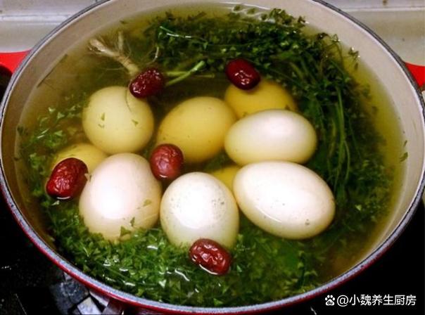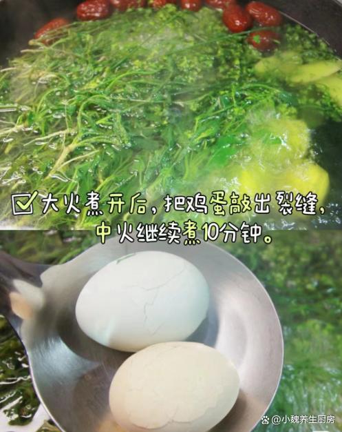 第五步:等待鸡蛋煮几分钟,将鸡蛋外壳敲碎,继续中火煮10分钟,让鸡蛋煮至入味,关火放凉即可,这款荠菜红枣煮鸡蛋就可以开吃了。 荠菜红枣煮鸡蛋的三月三的习俗之一,荠菜是非常常见的野草,搭配红枣,鸡蛋和生姜煮一锅,鸡蛋特别入味,把荠菜的营养发挥到极致,多吃荠菜煮鸡蛋,能够养肝明目,补气血,祛湿排毒,为身体提供许多能量,让你远离春困,精气神特别足。 你们是否掌握这款荠菜红枣煮鸡蛋的具体做法吗?(文中的配图都出自网络)