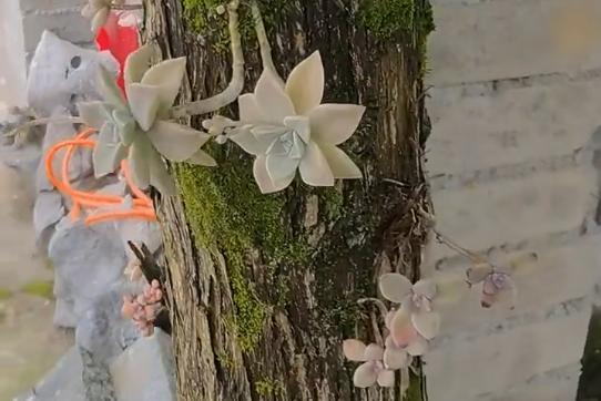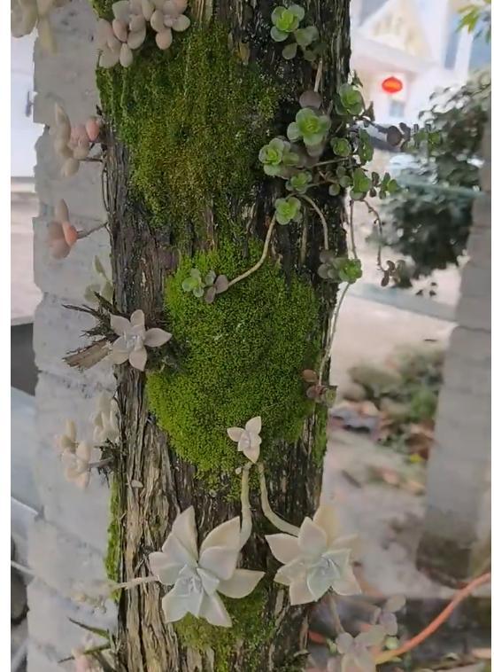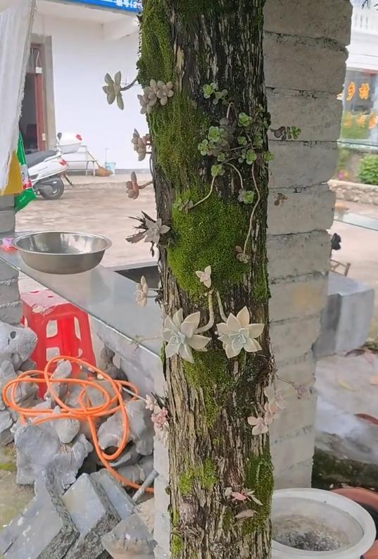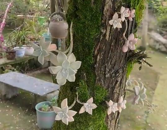 就比如说,在浙江湖州的一个独栋小院里,多肉攀附在树干上,别具一格,吸引了不少路人前来赏玩,晒出来让人欣赏。