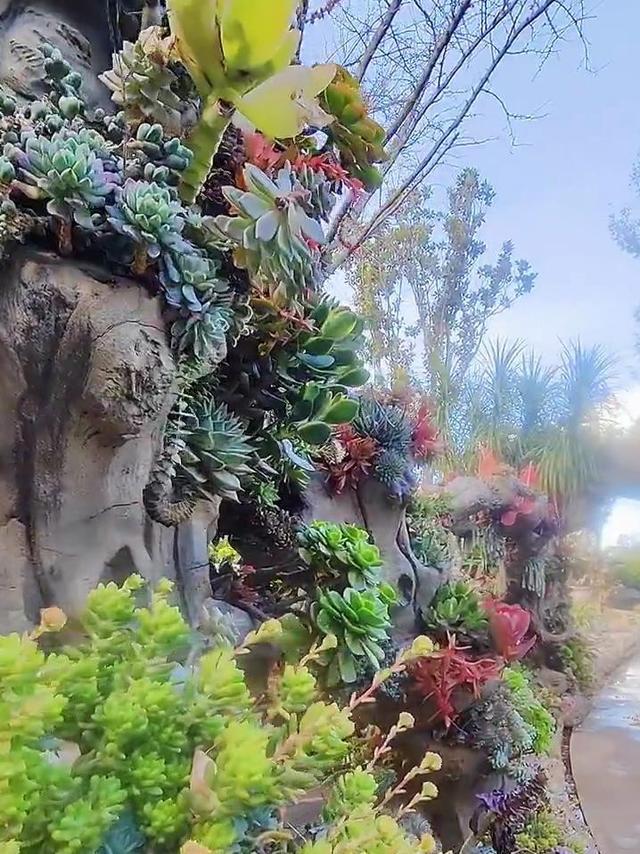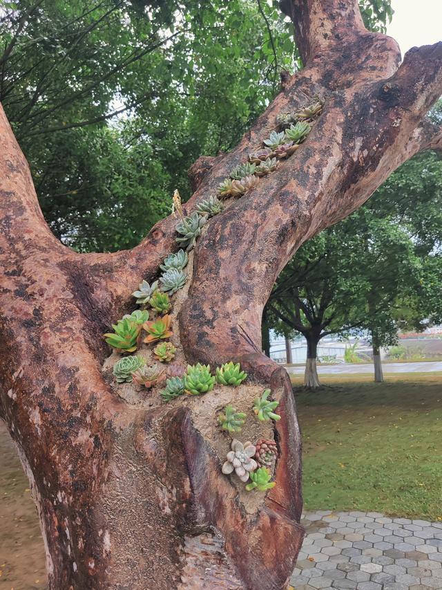 3、树干上的多肉,简直比老桩还美 同样,在广东一座普普通通的公园内,一位热心的花友在一棵大树上种植了多肉,不仅为公园增添了色彩,也为前来参观的市民带来了更多的观感享受。 许多人都热衷于将多肉培养成老桩,因为它们那千姿百态的妖艳,以及经历了岁月年环的沧桑,让人爱不释手,而生长在古树上的多肉,似乎又有一段特殊的故事。 公园内的这株老树,不知有多少年的历史,经历了时间的洗礼,才会变成现在这个样子,有好心的花友,将多肉种植在两根主干之间的沟壑中,虽然颜色、形状各不相同,但远远看去却十分协调。。 一根根枝条蜿蜒而上,让这株古老的树木重新焕发出了勃勃生机,像是一位百岁老者在保护一位年幼的孩子,很有艺术感。