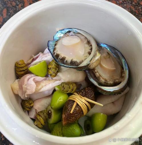 第三:将青橄榄清洗干净,或者用盐水浸泡,切成两半,鲍鱼用流水冲洗干净,用刷子清洗外壳,备用。第四:提前把排骨剁成若干小块,排骨用盐水浸泡洗净,用流水冲洗干净,大葱切成葱段,备用。 第五:锅中放入处理好的排骨,丢入一些姜片和葱段,记得要多加一些冷水,把排骨焯烫去腥处理,用温水冲洗表面浮沫,放在碗中备用。 第六:锅中加上少许油,倒入排骨煸炒一分钟,分别放入石斛,青橄榄,陈皮,黄芪和鲍鱼,也可以丢入一些红枣,别忘记多加一些纯净水,调到大火将汤汁煮沸。 第七:转至小火炖煮,让一些食材炖至软烂,最后根据喜好调味,只需要添加食盐和白胡椒粉即可,用勺子搅拌均匀就可以。第八:焖煮半分钟出锅,这款黄芪石斛鲍鱼排骨汤就制作完成了。 黄芪石斛鲍鱼排骨汤是广东人最爱喝的靓汤,青橄榄是两广独有的水果,搭配排骨,黄芪,石斛和鲍鱼炖一锅,营养价值特别全面,滋补气血,养肝补肾,好处多多。网友们,你们是否掌握这款黄芪石斛鲍鱼排骨汤的制作技巧吗?(文中的配图都出自网络)