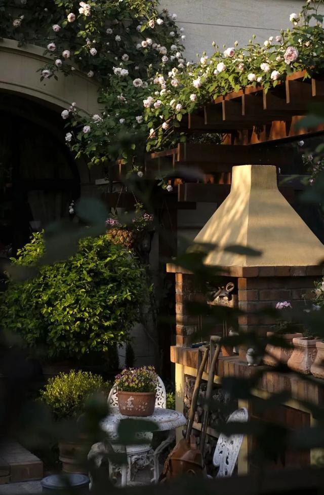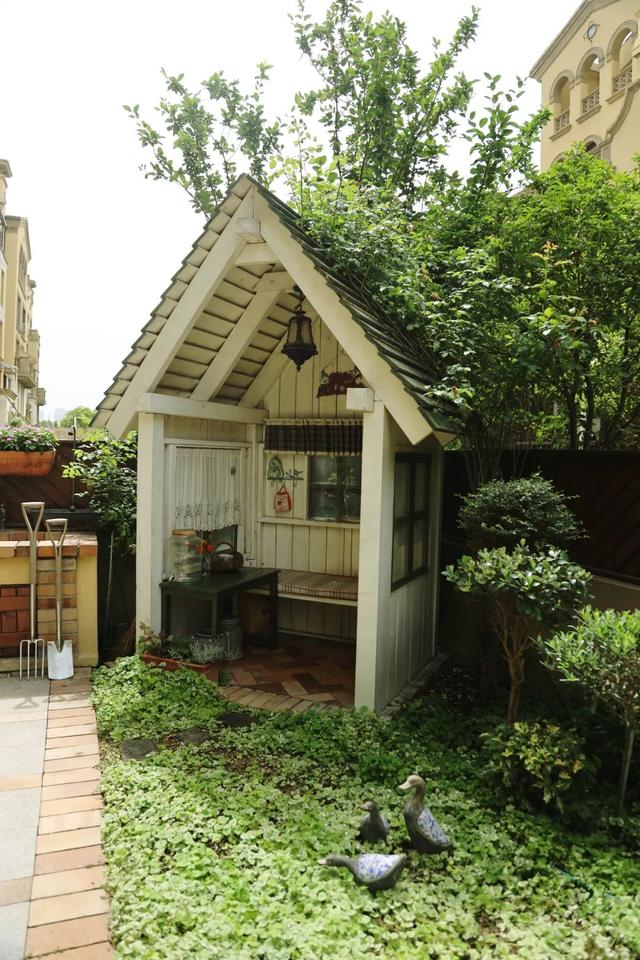 在花园的东南角落,有一座新鲜的小房子,屋顶是绿色的,墙壁是白色的,屋顶是绿色的,四周是欧月的藤萝,你可以想像到了四、五月份会是多么令人惊奇。木屋很小,只够两个人坐在上面。 在小木屋的北面,有一座巨大的壁炉,炉子上有一套烤肉用的器具,以及柴火。刘小姐很热情,她很高兴和她的朋友们一起到这个花园里来聚会。白天看着鲜花,喝着茶,晚上喝着啤酒,过着悠闲的生活。木制的椅子,铁制的椅子,都很精致。桌上的花瓶,每日都会有鲜花盛开,随心而变。干枯的花朵被悬挂在墙壁上,起到了装饰品的作用。