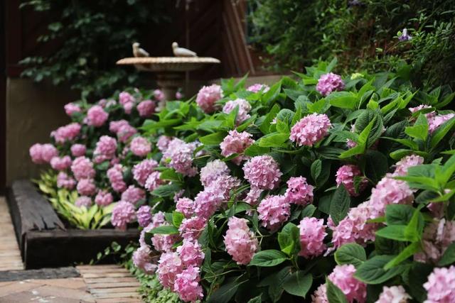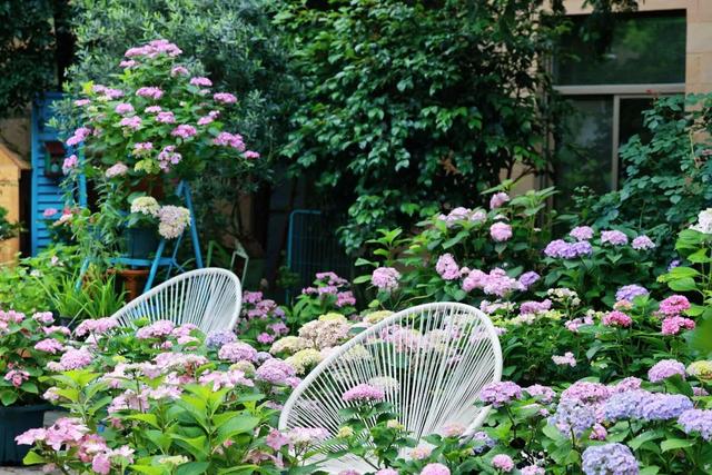 这个小型的地中海式花园大约只有50平方公尺,带有些许田园气息。褐色的木质大门,木质的质地很好,上面有一个中空的圆孔,将整个花园的墙壁都包裹在其中,给人一种宁静祥和的感觉。休闲区,铺着红色的地砖,还有防滑的地砖,踩上去有种脚踏实地的感觉。 5月正值“绣球季”,在陆阿姨的庭院外墙上,一簇簇的白绣球花开的正艳。花园里,一大片粉色的“无尽夏”(一种变异的绣球)成为了当之无愧的主角。