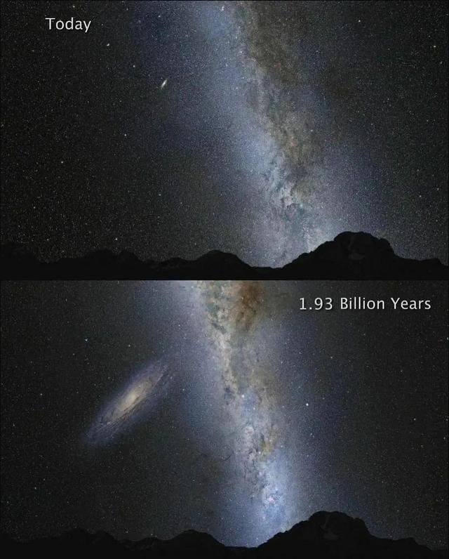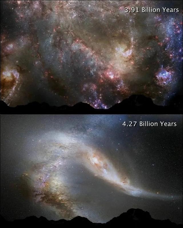 两个星系对彼此施加的引力已经超过宇宙膨胀的力量了时至今日,碰撞的发生日期被精确到了37.5亿年后,,并且在相撞发生之前的5亿年,仙女座星系周围的暗物质和引力就会开始扰动银河系内的恒星分布。
