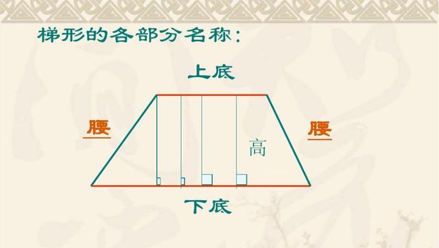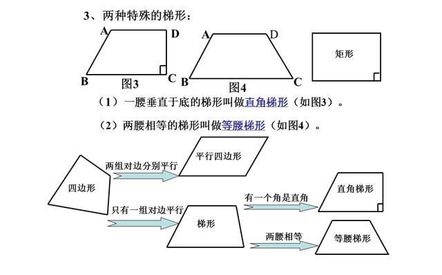梯形的特征:有四个边,有两边平行,长边为下底,短边为上底;另外两边为腰,不平行;如果一腰垂直于底的为直角梯形﹔如果两腰相等的梯形为等腰梯形。梯形要比平行四边形,长方形,正方形范围都广,平行四边形,长方形,正方形其实都是梯形的特殊情况。