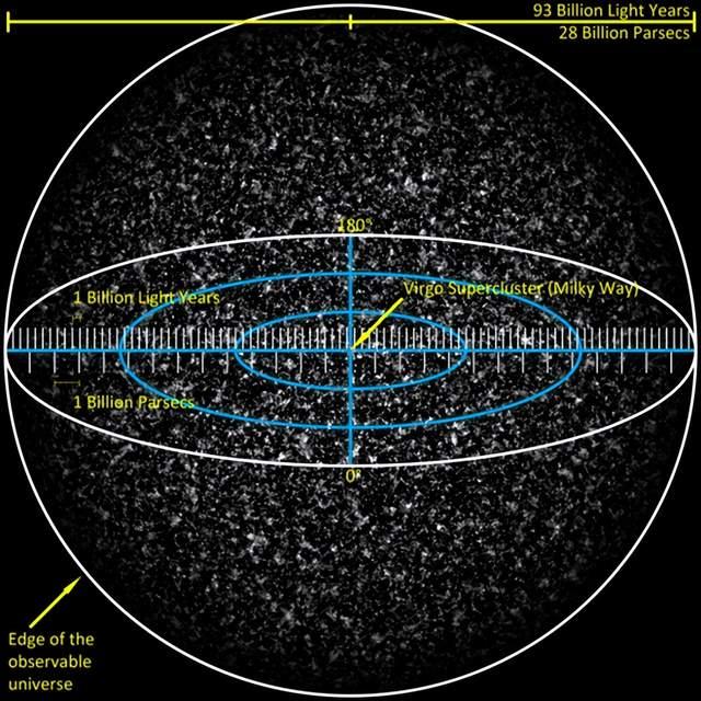 这就要根据宇宙膨胀的形状来决定了,假如宇宙是一个球形,那么它就是封闭的,自然也存在边界,但假如它是喇叭形,我们就只能找到它的起点,永远也找不到终点,这就好比手电筒射出的一道光,既然无法看见黑暗的背后,不如来看看在当前的可观测宇宙都存在什么。 当我们站在十亿光年之外看宇宙时,看到的大部分是漆黑一片,只有几个零零散散的光点,它们都是大大小小的恒星,点亮了整个银河系,太阳也在其中,只不过在密集地点中找一个普通的太阳犹如大海捞针,我们还需要再放大一点看看。(www.ws46.com)